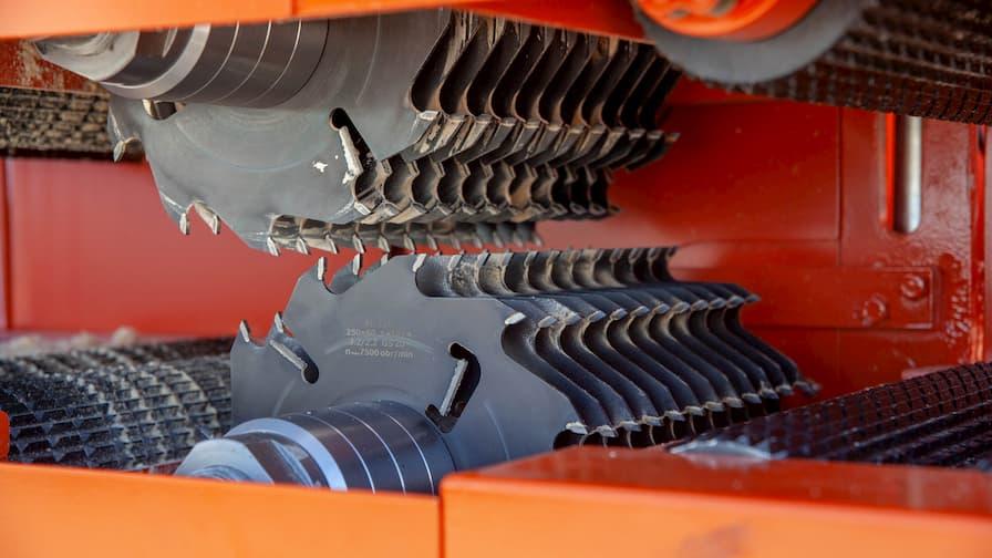 Každý hřídel je osazen až 12 kotoučovými pilami s průměrem od 200 do 350 mm.