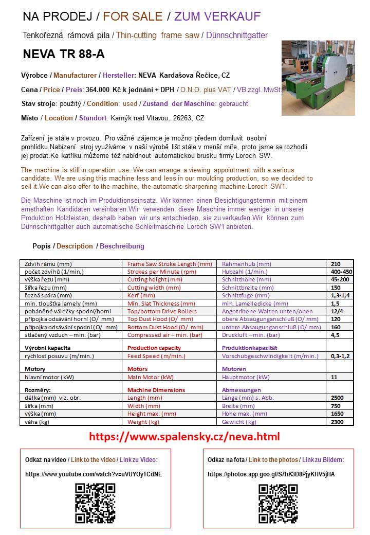 | Gyártó és típus : | Jemnoř. rámová pila NEVA TR88A |